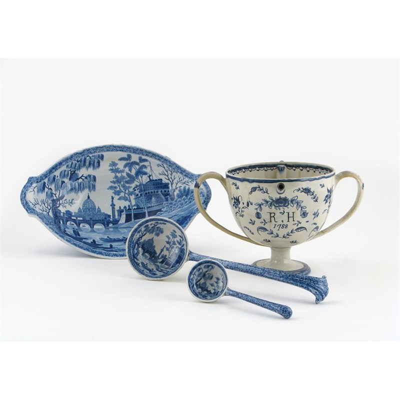 A dated pearlware loving cup, painted in blue with the inscription 'R H 1788' amidst stylized flower sprays, a Spode tazza and two ladles printed with figures before a bridge, some damage and restoration, 31.5cm max. (4)
