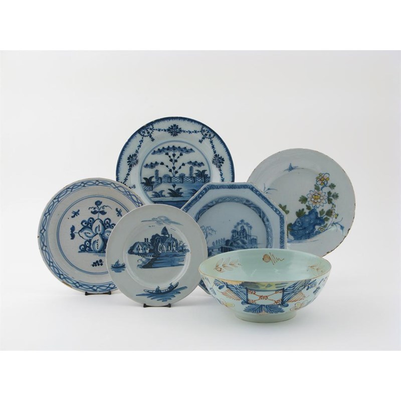 Eleven delftware plates and a bowl most 18th century, variously decorated in blue, polychrome and manganese with Oriental figures in landscapes, flowers and fruit, damages and restoration, 23cm max. (12)