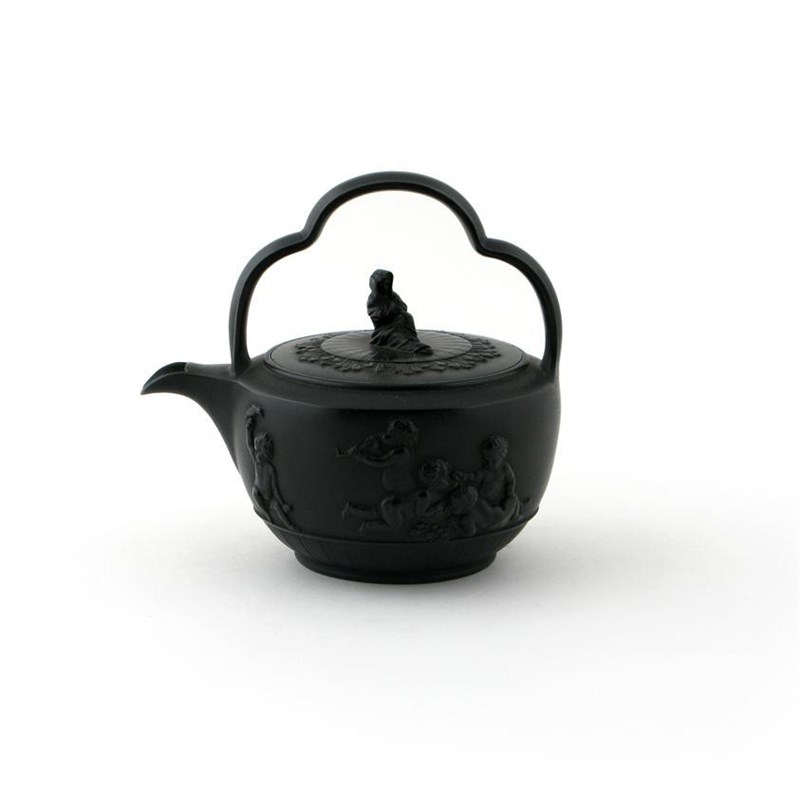 A Wedgwood black basalt wine pot and cover c.1790, the body applied with scenes of putti at various pursuits, the cover with a Sibyl knop, impressed 'Wedgwood' mark, some restoration, 18cm. (2)