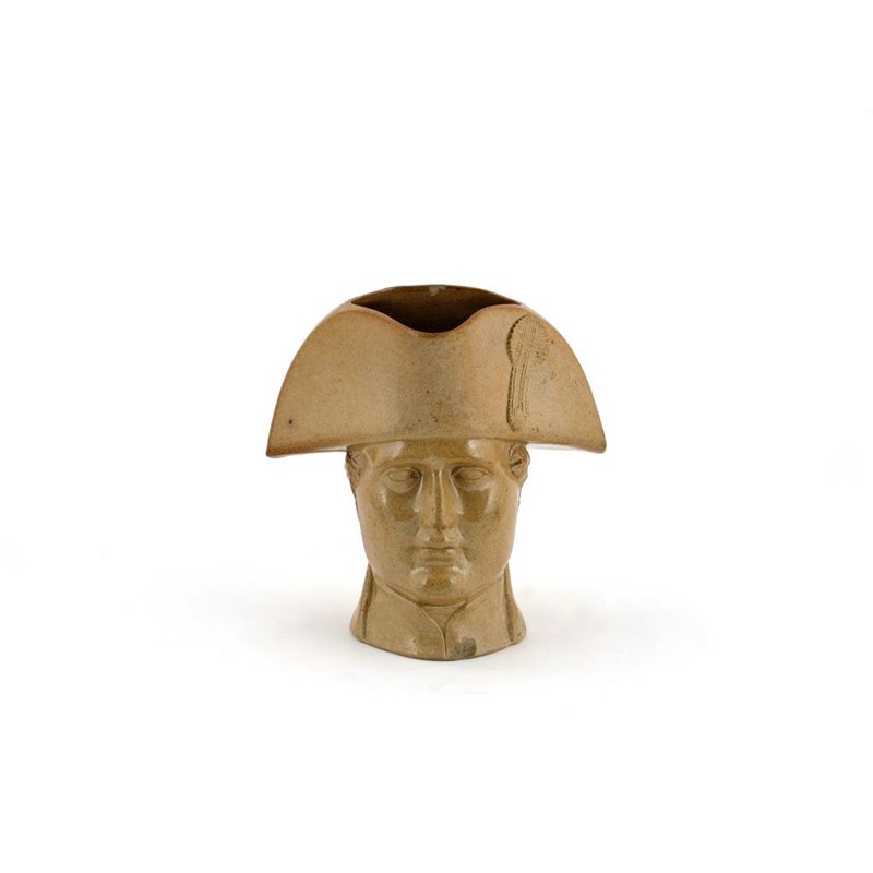 Napoleonic interest: a brown stoneware portrait jug 19th century, of Napoleon wearing a tricorn hat, impressed P to the base of the handle, applied mark for 'Stephen Green Lambeth' to the base, a chip to the base, 21.5cm.