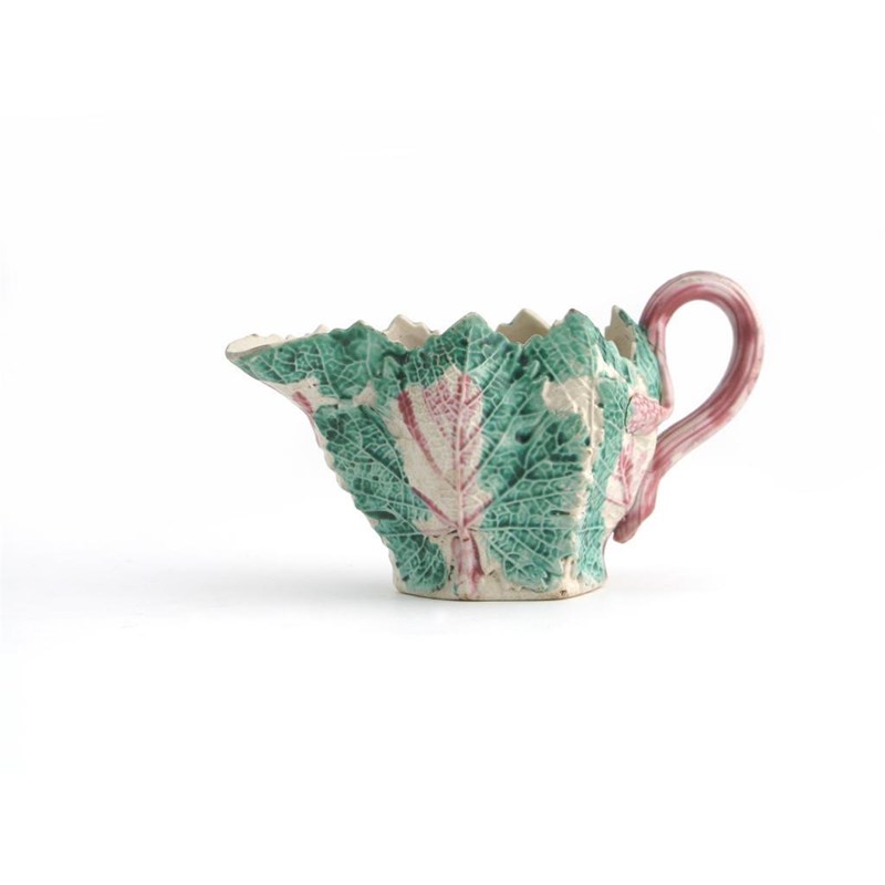 A small salt-glazed leaf moulded cream jug c.1760, the folds and veins of the leaves picked out in green and pink enamels, minor faults, 12cm.