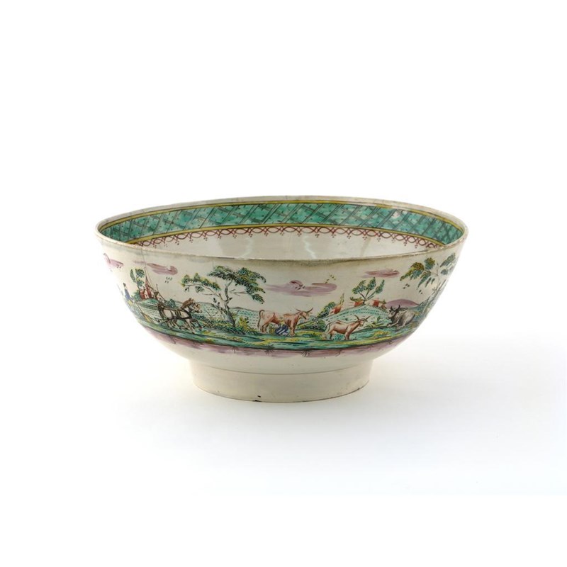 A massive pearlware bowl late 18th / early 19th century, the exterior painted with a farming scene, a ship and a four line stanza, the interior with a swan and cygnet, cracks, 39cm dia.