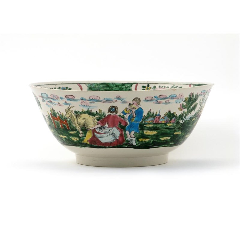 A good salt-glazed punch bowl 2nd half 18th century, painted with a young girl milking a goat, a ragged boy beside her, drinking from a bowl, in a village landscape, the reverse and interior with vignettes of rural buildings, the interior rim with a border of four floral panels between green diaper bands, two tiny rim chips, 29.5cm.