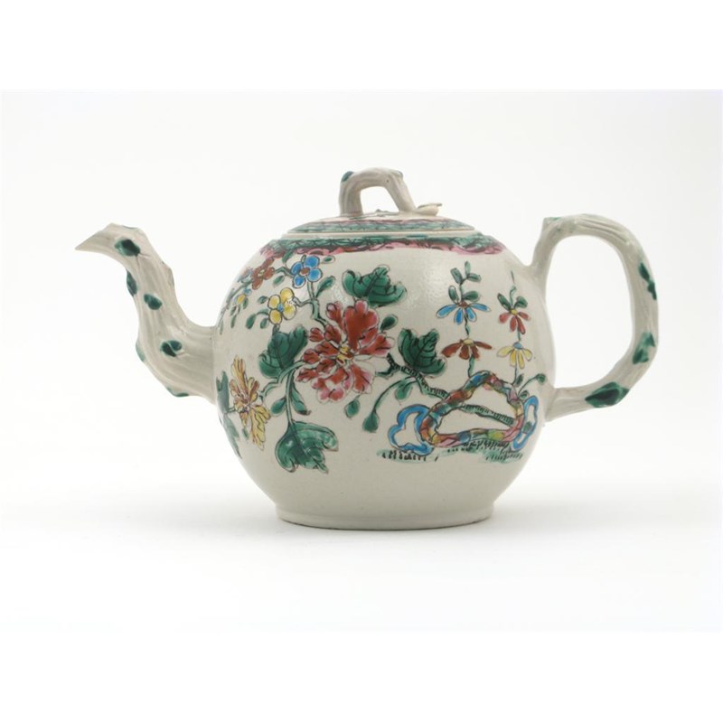 A salt-glazed teapot and cover 2nd half 18th century, brightly enamelled with peony and prunus issuing from stylized rockwork, the handle and spout formed as gnarled twigs, a little restoration to the spout, 18cm. (2)