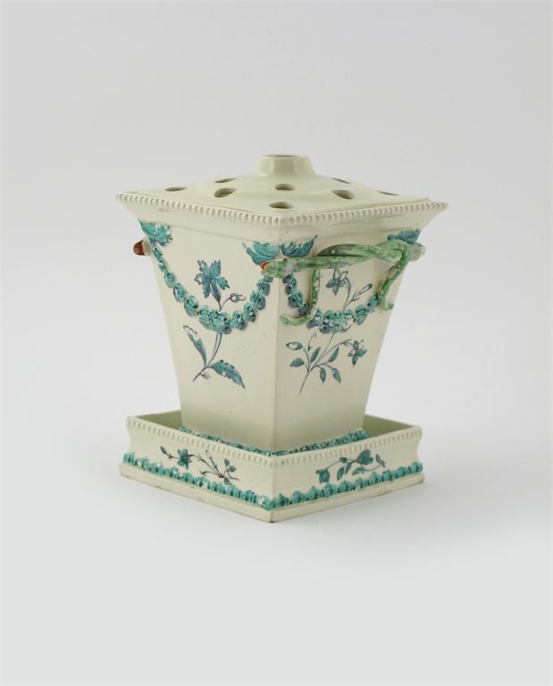 A Neale & Co creamware fern pot, cover and stand c.1780-90, with double serpent handles, moulded with foliate swags and acanthus leaf borders, with flowers painted in green and manganese, the cover restored, some wear, 20cm. (3)