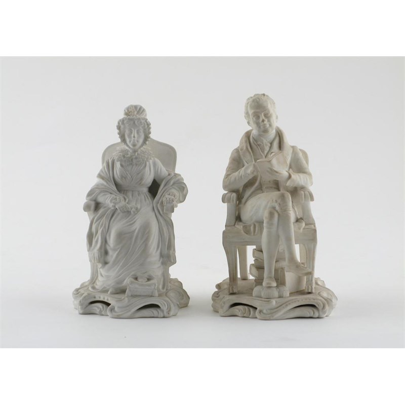 A pair of Minton Parian figures 19th century, of William Wilberforce and Mrs Hannah More, the latter after the painting by H. W. Pickersgill, both seated in armchairs and raised on scrolling bases, unmarked, 18.5cm. (2)
