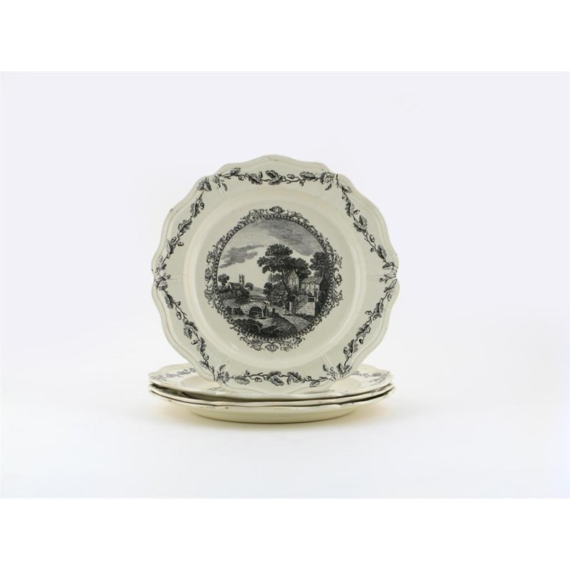 Four Wedgwood creamware plates late 18th century, printed in black with a figure fishing before a bridge, a cowgirl herding her charges, within an oak leaf garland border, 25cm. (4)