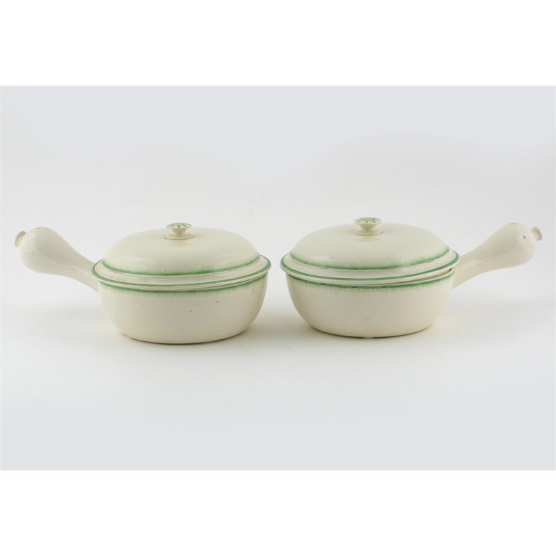 A pair of creamware handled tureens and covers c.1800, enamelled with bands of apple green, 29cm across. (4)