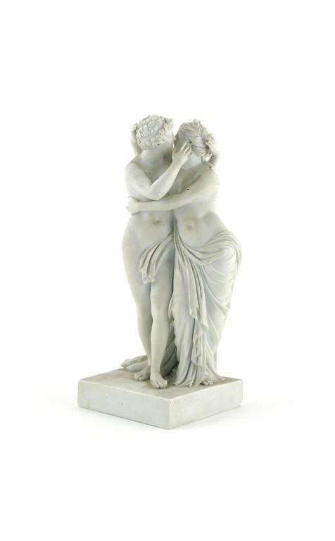 A Meissen biscuit porcelain group of Cupid and Psyche 19th century, the lovers entwined in an embrace, a length of drapery preserving their modesty, raised on a square base, blue crossed swords mark and incised 'D79', small losses, 29cm.