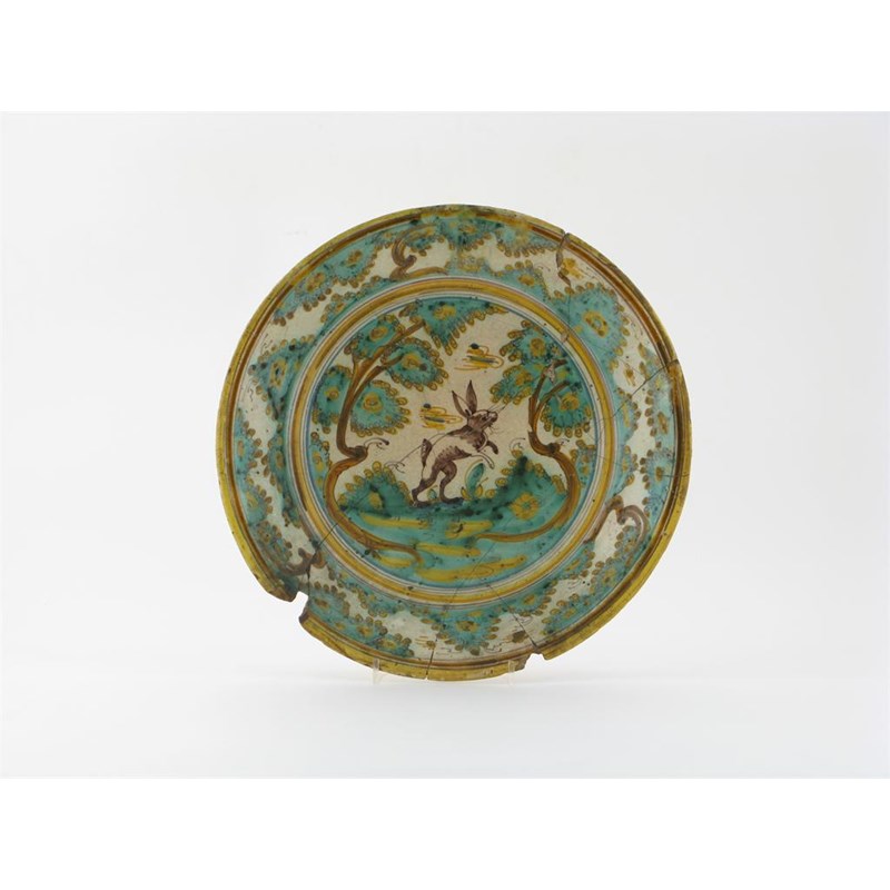 A Talavera or Puente del Arzobispo dish 17th century, painted in a typical palette with a large rabbit raised on its haunches between two trees, within a border of branches, damaged and riveted, 37.5cm.