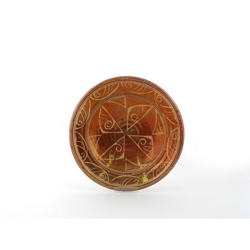An Hispano-Moresque lustre dish 16th century, decorated with a geometric foliate design in a rich copper lustre, broken in half and repaired, 33cm.