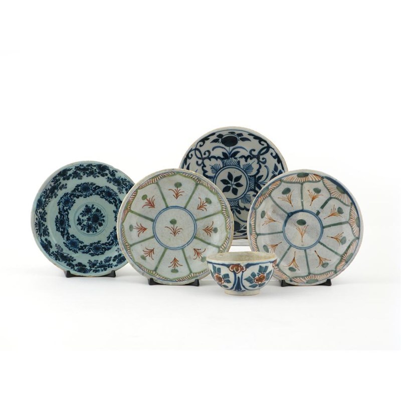 Four delftware saucers 2nd half 18th century, two decorated with a stylized flowerhead design in green and red, two others with differing floral designs in blue, and a similarly decorated teabowl, restoration, 11.3cm. (5)
