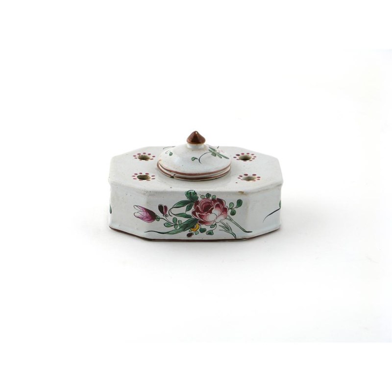 A Strasbourg faïence inkwell and cover 19th century, set with four small holes around a central well, painted with flowers in a typical palette of green and magenta, damage to the inset well, 12.2cm. (3)