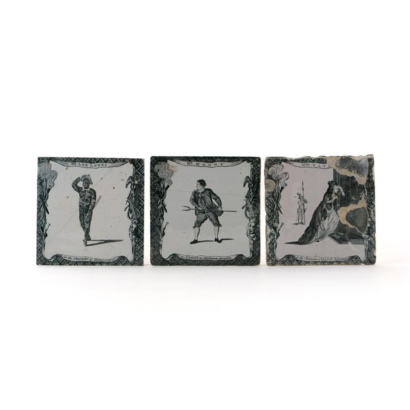 Theatrical interest: three delftware printed tiles 2nd half 18th century, probably Liverpool printed by Green, in black with three famous thespians in well known roles, within borders of theatrical motifs, titled, damages, 12.5cm. (3)