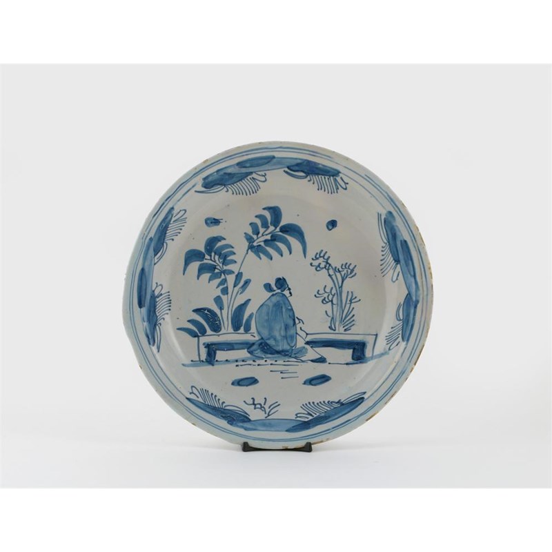 A delftware saucer dish late 17th century, probably Brislington or London, painted in blue with a seated Chinese figure in a garden scene, a restored rim section, 22cm.