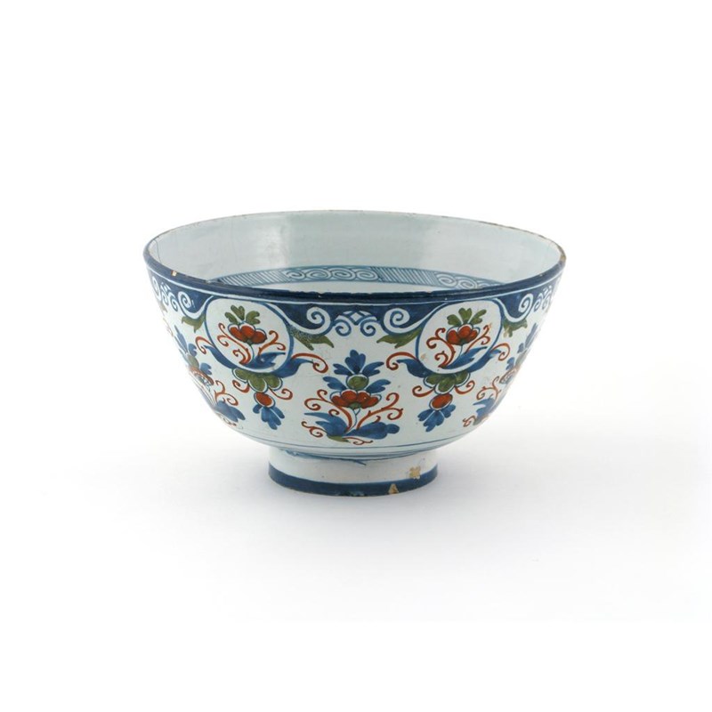 A deep English delftware bowl 1st half 18th century, the exterior painted in blue, red and green with stylized foliate motifs, the interior with a blue motif beneath a hatched band, broken and riveted, 25cm dia.