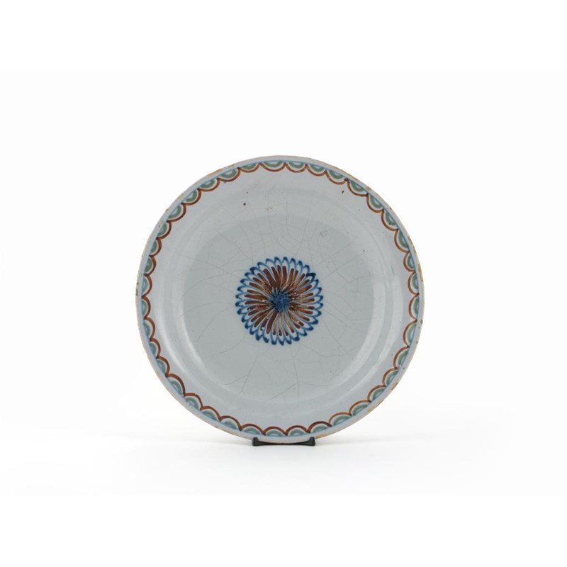 A delftware saucer dish 2nd half 18th century, probably Lambeth, painted with a central stylized flower head in red and blue, within a scalloped border of green and red, 22.7cm.