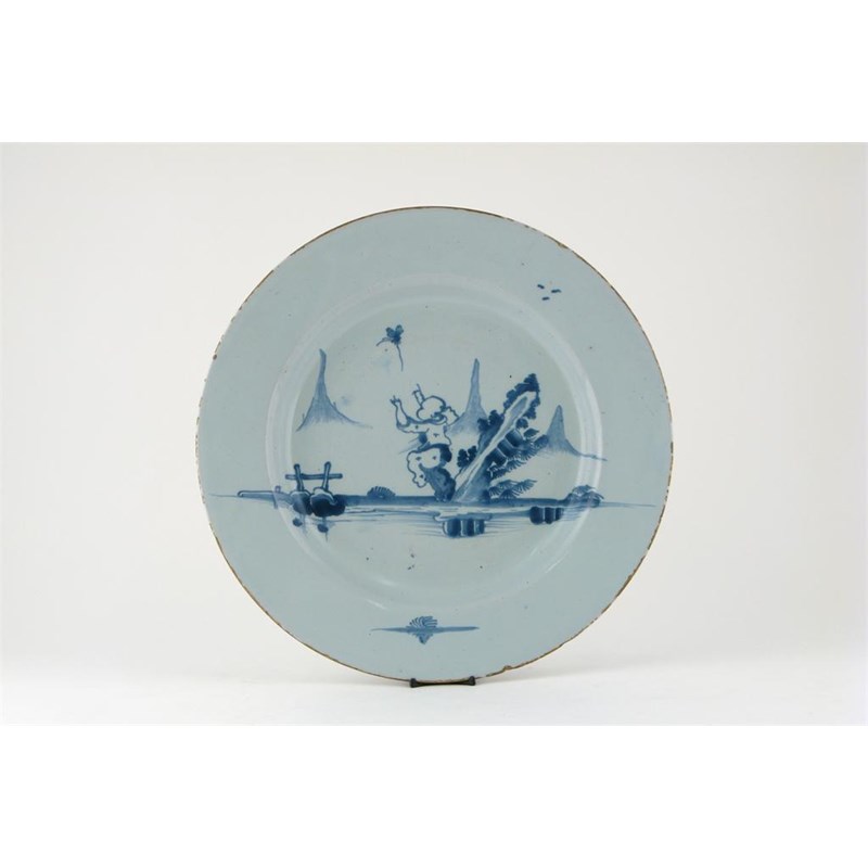 A large delftware dish 2nd half 18th century, perhaps Brislington, painted in blue with a Chinese boy chasing a butterfly before mountains, 36cm.
