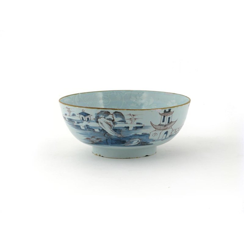 A delftware bowl 2nd half 18th century, the exterior painted in blue and manganese with buildings in an Oriental landscape, the interior inscribed 'One Bowl More And then' beneath a bianco-sopra-bianco border, a section broken out and reglued, 23cm.