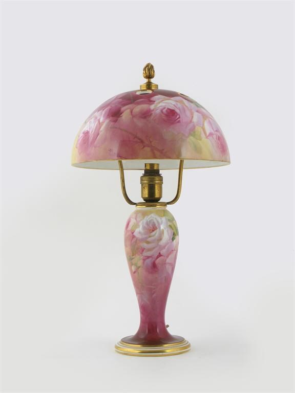 A Minton porcelain lamp c.1900, painted by James Dean with large pink roses, signed, impressed marks and indistinct date code, 47.5cm.