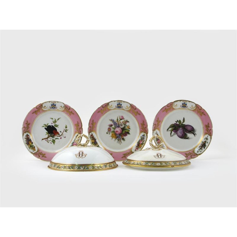 Three English porcelain armorial tazzae 19th century, the wells painted with flowers and fruit, the rims with the crest for Hope within a pink border, and two porcelain covers bearing the Hope monogram, some damages, 24cm max. (5)