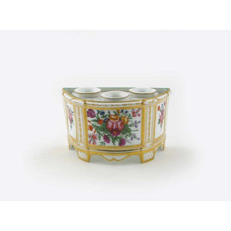 A Paris porcelain bough pot and cover 19th century, painted with floral arrangements in three panels, the cover pierced with three lipped openings, some restoration to the cover, 24.5cm. (2)