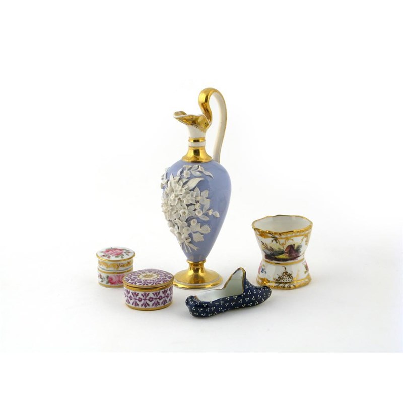 A Daniel egg cup 1st half 19th century, painted with buildings and flowers, an English porcelain ewer applied with an effusion of flowers in white on a lilac ground, two miniature boxes and covers and a jewelled model of a slipper, 16cm max. (7)