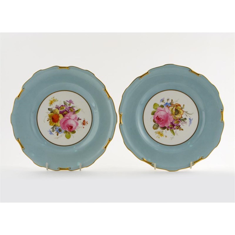 A pair of Royal Crown Derby plates, painted by Cuthbert Gresley with floral arrangements within pale blue borders, signed, printed marks and date codes for 1939, 23cm. (2)