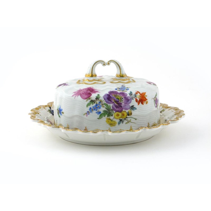 A Meissen butter dish and cover 19th century, the moulded form painted with large sprays of deutsche Blumen within elaborate gilt scrolling borders, cancelled blue crossed swords mark, 20.5cm. (2)