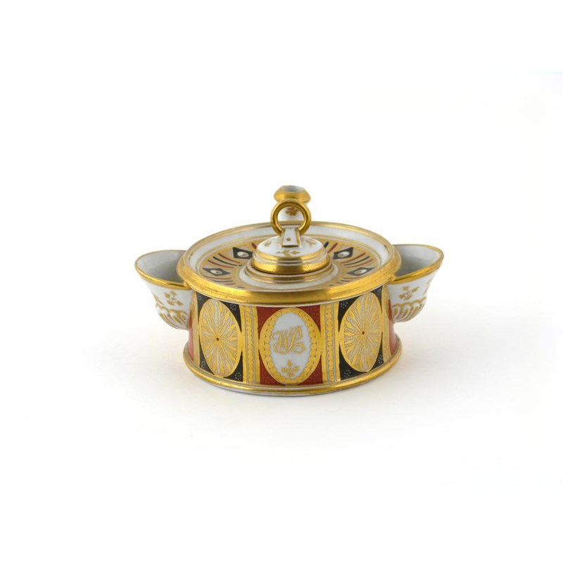 A Derby inkwell with cover and liner c.1810, decorated with a geometric design in gilt, black and red, bearing the monogram 'WP', unmarked, a small chip to the cover, 15cm across. (3)