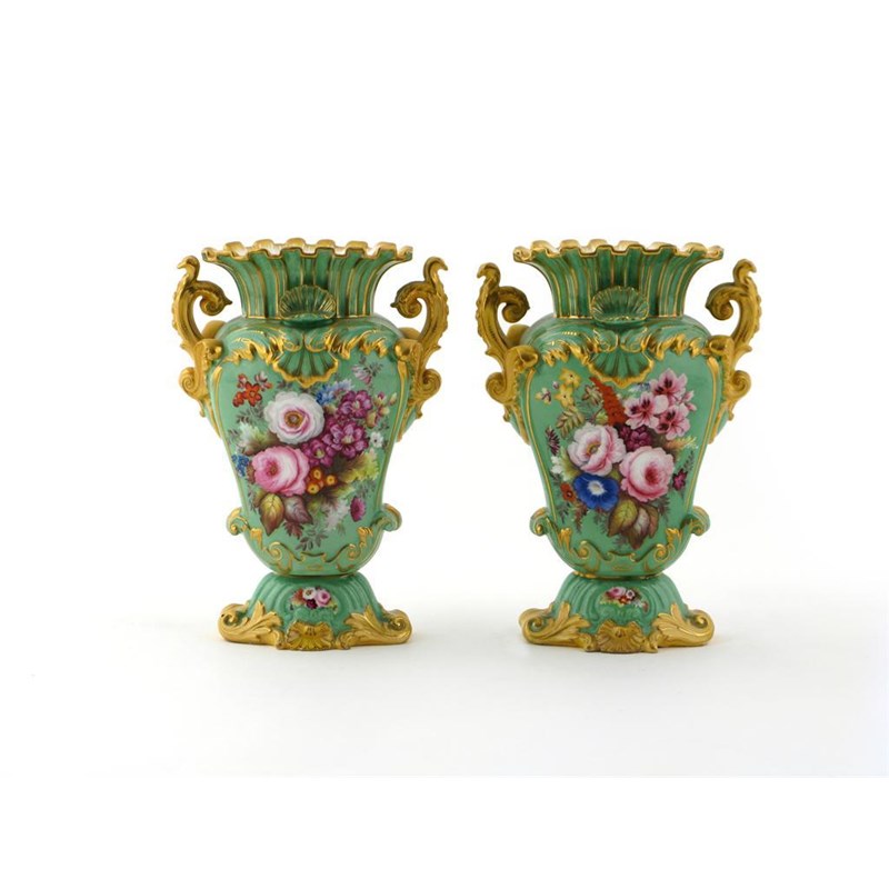 A pair of English porcelain two-handled vases 1st half 19th century, each side boldly painted with flowers on an apple green ground, within rococo moulded panels, 20cm. (2)