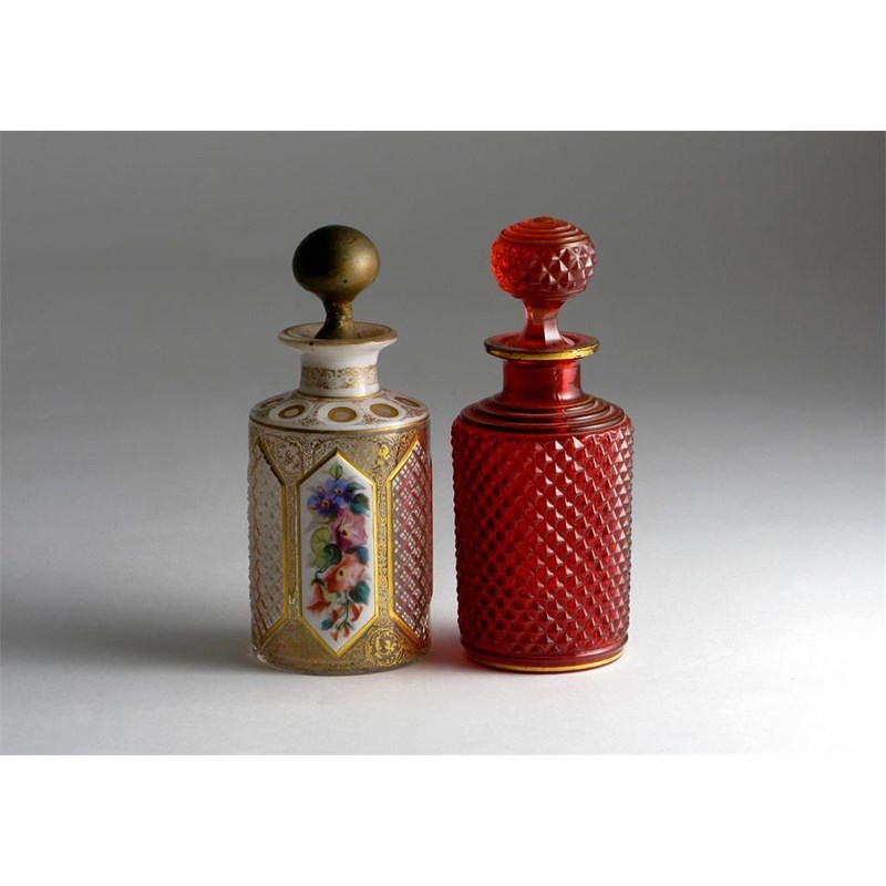 A Baccarat ruby glass scent bottle and stopper 2nd half 19th century, the diamond banded body highlighted with gilt bands, moulded 'BACCARAT' mark to the base, and a Bohemian glass bottle and stopper, flashed with opaque bands painted with flowers, damage to one stopper, 14.5cm. (4)