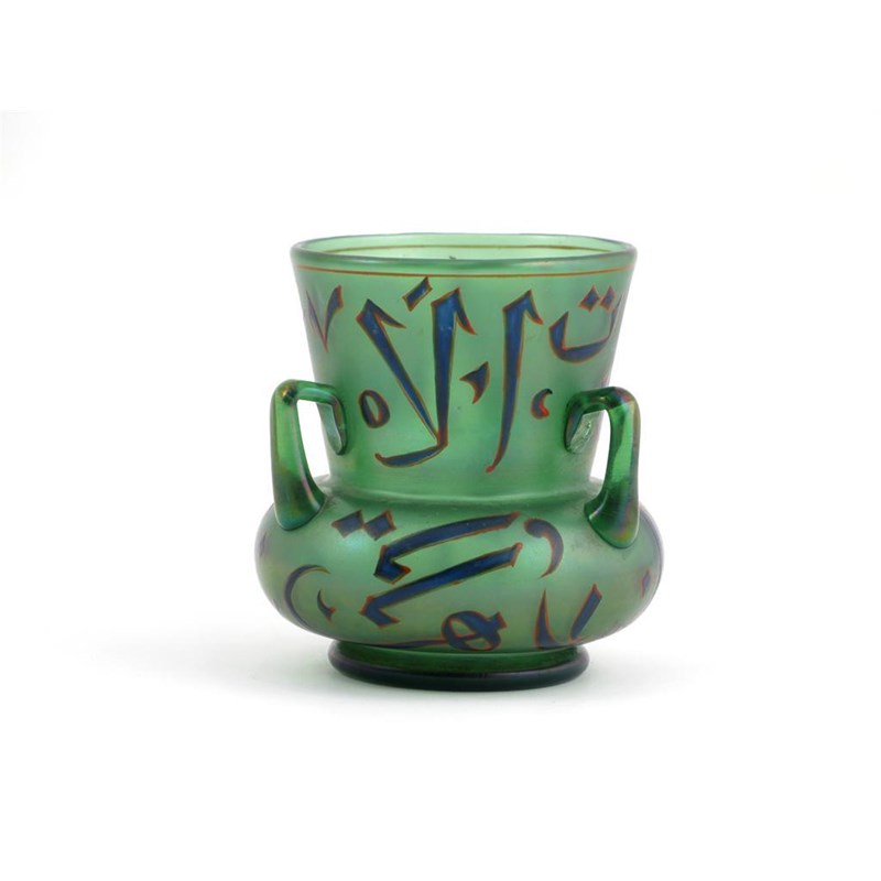 A Moser glass Mosque lamp c.1900, painted with stylized script in blue and red enamel on a green ground, printed mark to the base, 15.5cm.