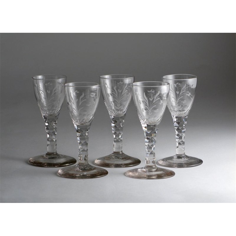 Five small wine glasses c.1780, each engraved with a spray of flowers, a bee to the reverse, raised on faceted stems, 12cm. (5)