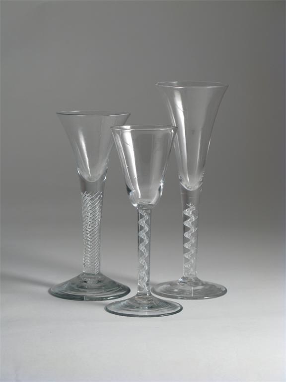 Three wine glasses 18th century, two flaring from the foot with differing airtwist stems, the third a flared bowl raised on an airtwist stem, 21.7cm max. (3)