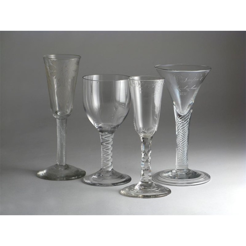 An ale glass mid 18th century, the bowl engraved with hops and barley, raised on an airtwist stem, another ale glass with faceted stem, an early folded foot wine glass, later engraved with 'W Taylor 1836', and a late wine glass raised on an opaque twist, minor faults, 20cm max. (4)