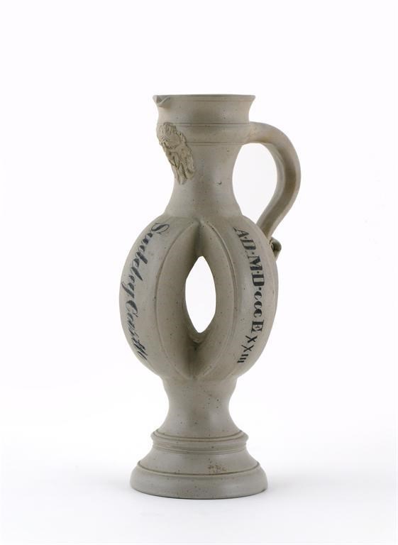 A salt-glazed stoneware cruciform ewer dated 1823, the spout with a maskhead, incised with 'Sudeley Castle', monogrammed initials and the date in Roman numerals, the handle broken off and repaired, 32.5cm.