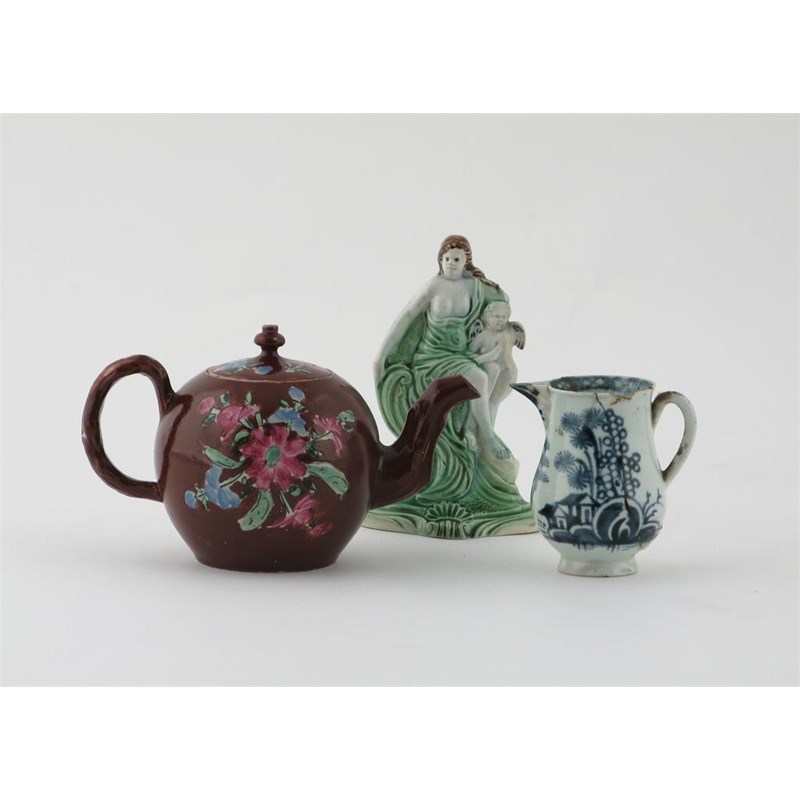 A small salt-glazed teapot and cover painted with flowers and enamelled in deep red, a Whieldon-type figure of Venus and Cupid, and a Pennington Liverpool blue and white jug, some damages, 16cm max. (4)