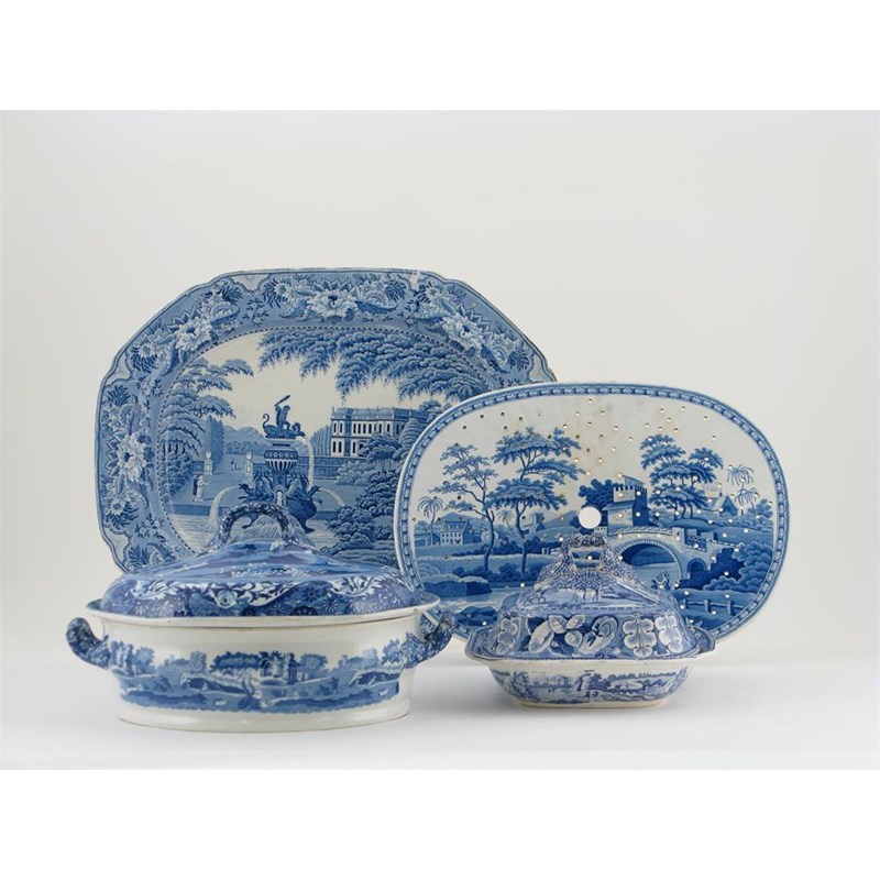 Two blue and white tureens and covers 19th century, printed with scenes of figures in landscapes within floral borders, a two-handled dish, charger and strainer with similar decoration, 51.5cm max. (7)