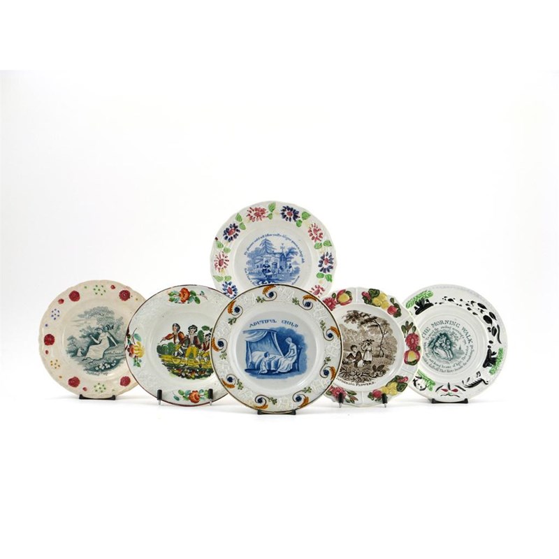 Six Pratt or pearlware children's plates 19th century, the wells printed with scenes of children at various pursuits within moulded and painted rims, a section of one rim broken, 18cm. (6)
