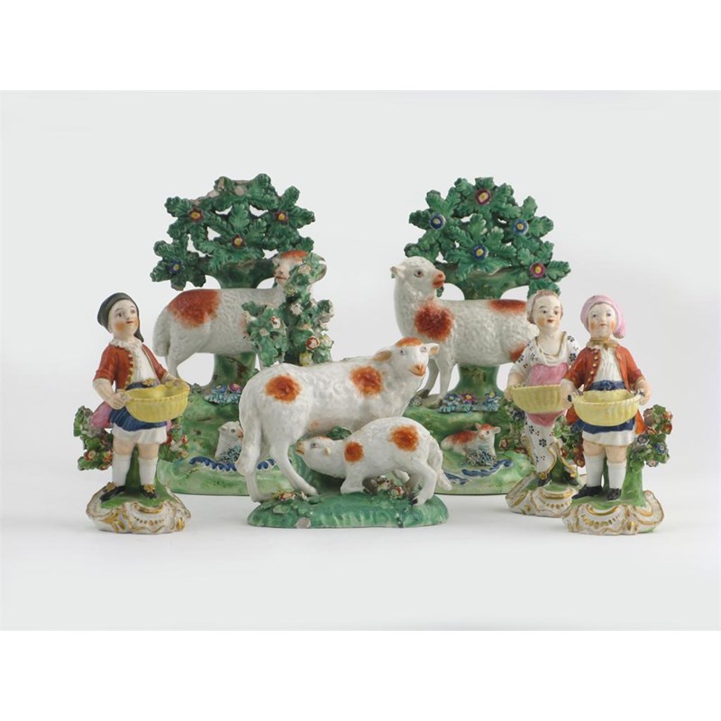 Three Derby sweetmeat figures c.1775, modelled as small children holding baskets before them, a Derby model of a ewe suckling its lamb, incised numbers, and a pair of Walton pearlware sheep and lamb groups, applied marks to the reverse, some damages, 18cm max. (6)