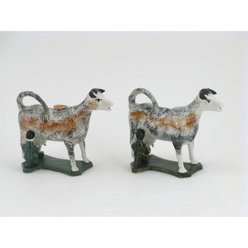 Two pearlware cow creamers, the bovines sponge-decorated in ochre and black, the bases and maids glazed in green, one with a cover, c.1800, 17cm. (3)