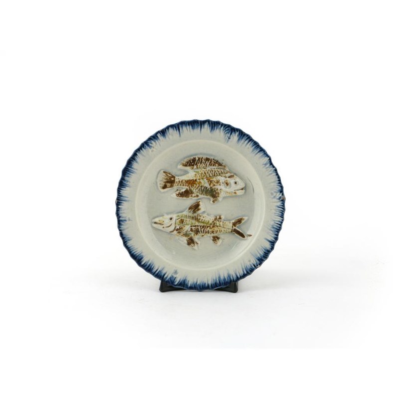 A small Pratt ware plate late 18th century, the well moulded with two fish, their scales highlighted in typical shades of ochre and umber, within a blue feather-moulded rim, 10.8cm.