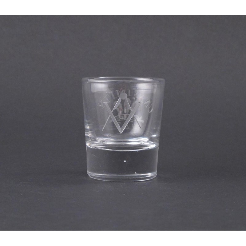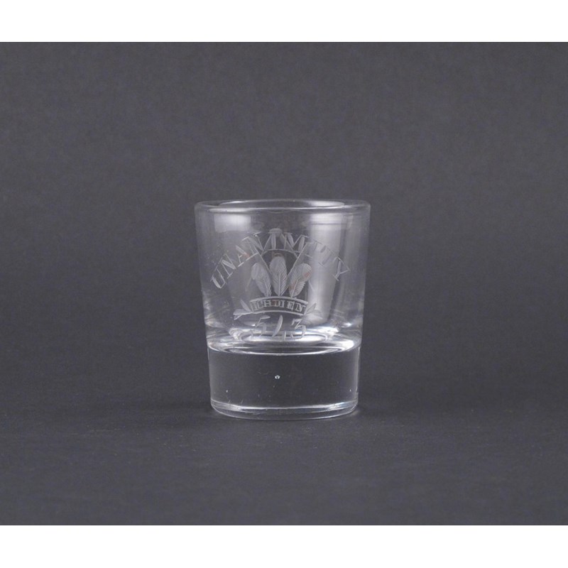 A Masonic firing glass 19th century, one side engraved with a set square and compasses around the letter G, the reverse titled 'Unanimity' above the Prince of Wales feathers and the lodge number '543', 6.5cm.