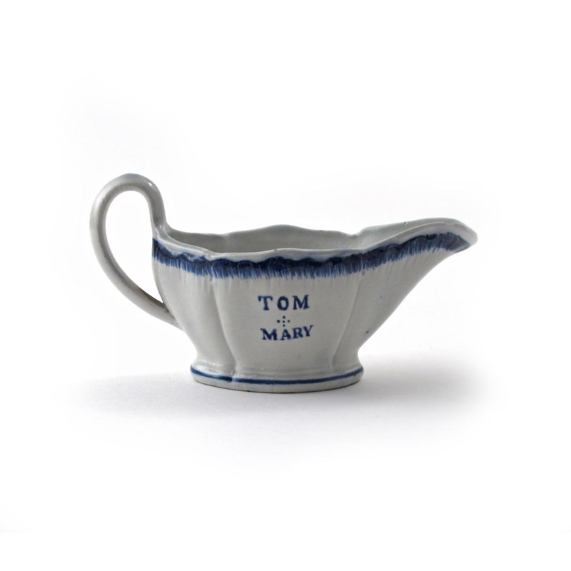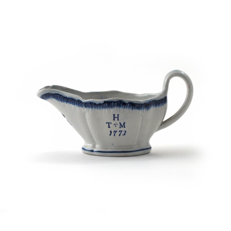 A pearlware 'marriage' sauceboat dated 1773, with a blue feathered edge, one side inscribed 'Tom * Mary' the other with the letter H over T*M and the date 1773, cracked, 15cm.