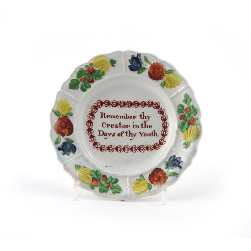 A good child's pearlware plate early 19th century, the rim moulded and coloured with vignettes of fruit and flowers, the well inscribed 'Remember thy Creator in the Days of thy Youth', 13.7cm.