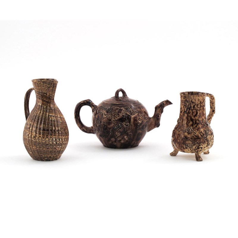 A creamware teapot and cover and similar jug late 18th century, decorated in a mottled Whieldon type glaze and applied with fruiting vine, the jug raised on three paw feet, and an agateware jug with moulded ribbed body, 19cm max. (4)
