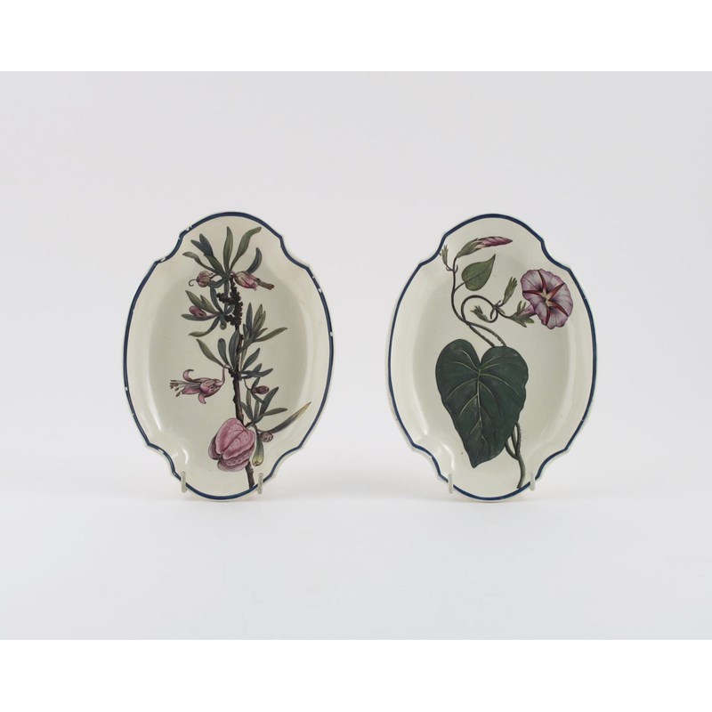 A good pair of creamware botanical dishes c.1800, perhaps Davenport, of lobed oval shape, finely painted with botanical specimens, titled 'Cape-Aitonia' and 'Convolvulus-Major' in red to the reverse, blue line rims, 22cm. (2)
