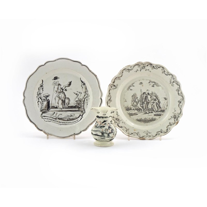 Two creamware plates and a jug c.1770-80, one plate painted in black with a central figure of Liberty, titled 'Voor Vryheid En Broederschap', the other perhaps of Benedict and Maurus with a scholar writing at a desk, dictated to by a standing figure beset by demons, a pair of scales discarded on the ground, and a creamware jug painted in black and red with Abraham's sacrifice of Isaac, small damages, 24.5cm. (3)