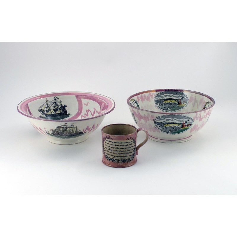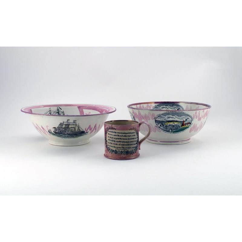 Two large Sunderland lustre bowls of shipping and military interest 1st half 19th century, one Moore & Co, decorated with several ships including the Great Eastern Steam-Ship, La Bretagne and the Victoria and Albert Yacht, the other commemorating the Treaty of Amiens in 1802, printed with various verses and the English and French flags, and a lustre mug decorated with a steam ship, some damages and repairs, 33cm max. (3)